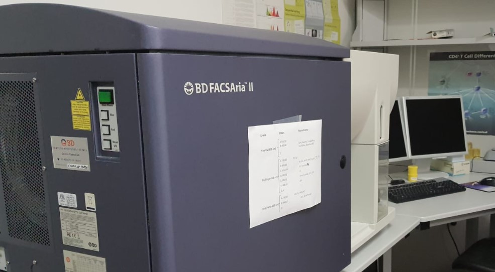 Il Laboratorio di Citofluorimetria a Flusso consente di rilevare, identificare ed isolare specifiche popolazioni cellulari di origine ematopoietica e non. L'uso di metodologie citometriche permette di studiare specifici processi cellulari quali proliferazione, apoptosi, attivazione di vie di trasduzione del segnale e di studiare il ciclo cellulare. Queste informazioni vengono ottenute grazie a protocolli di colorazione che prevedono valutazione delle caratteristiche fisiche delle cellule (taglia e complessità interna), presenza o assenza di particolari marcatori presenti sulla superficie o all'interno delle cellule stesse, permeabilità a molecole fluorescenti capace di legare il DNA e misurazione del contenuto cellulare del DNA stesso. I macchinari in uso sono un Sorter modello CytoflexSRT (Beckman Coulter) equipaggiato con equipaggiato con tre sorgenti laser a 405, 488 e 633 nm, un Sorter FACSAria II (Becton Dickinson) equipaggiato con tre sorgenti laser a 375, 488 e 633 nm per permettere analisi ed isolamento di specifiche popolazioni cellulari a partire da campioni eterogenei ed un analizzatore modello DAKO Galaxy equipaggiato con due laser a 488 e 635 nm ed una lampada UV.